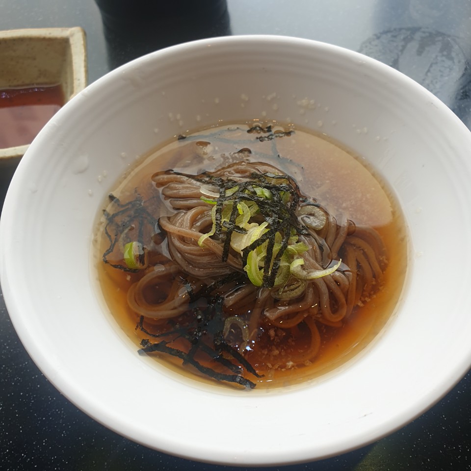 이 가게는 그만큼 오래된 가게이기도 한게 장국이 김밥천국처럼 저절로 움직인다. ㅋㅋ 냉모밀은 미니사이즈로 나왔다.