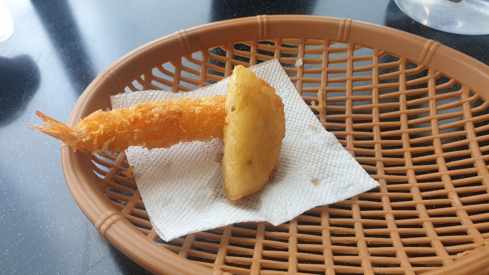 초밥 12개에 튀김, 우동, 새우튀김이 나오는데 계절에 따라 우동은 여름이라 냉모밀이 나온다.
