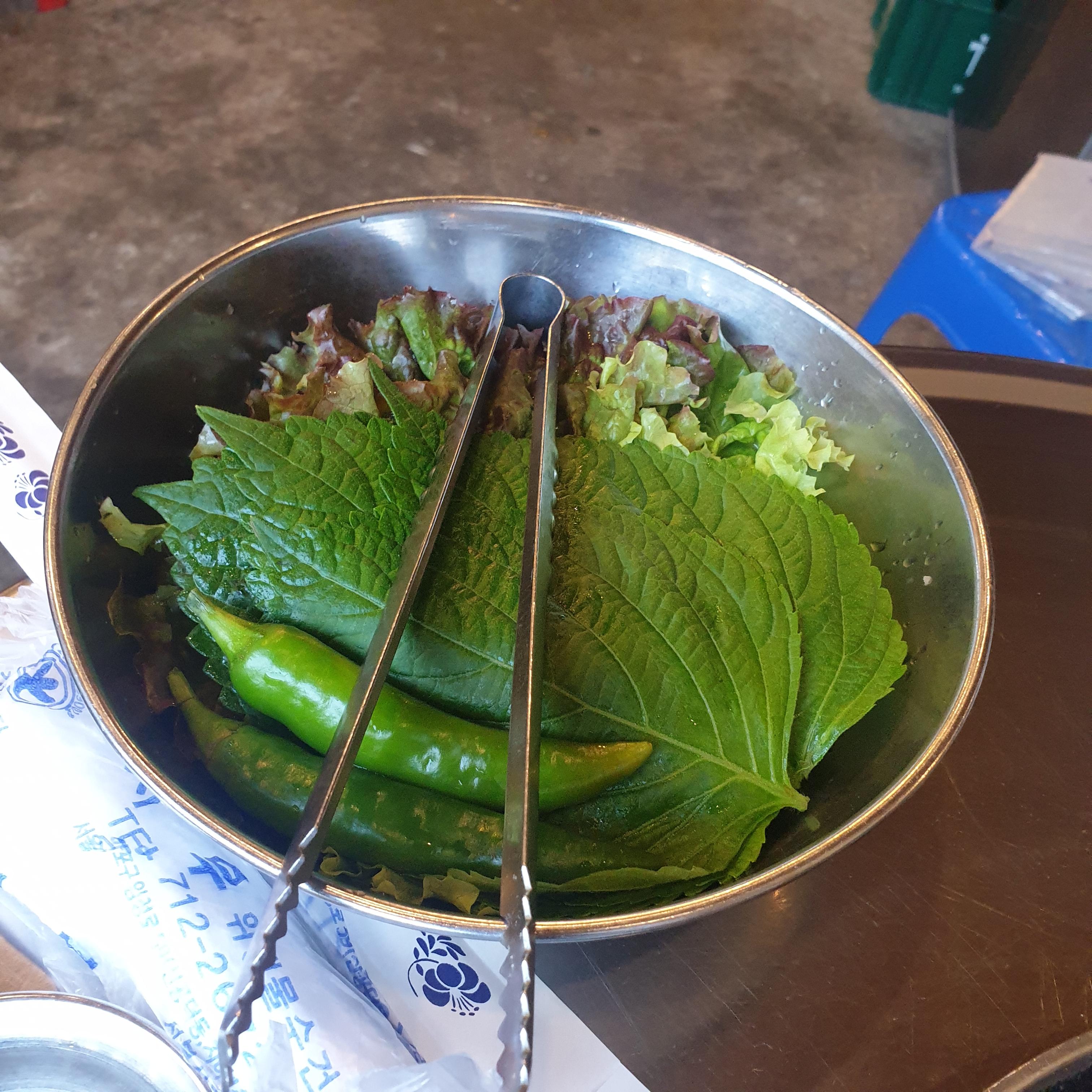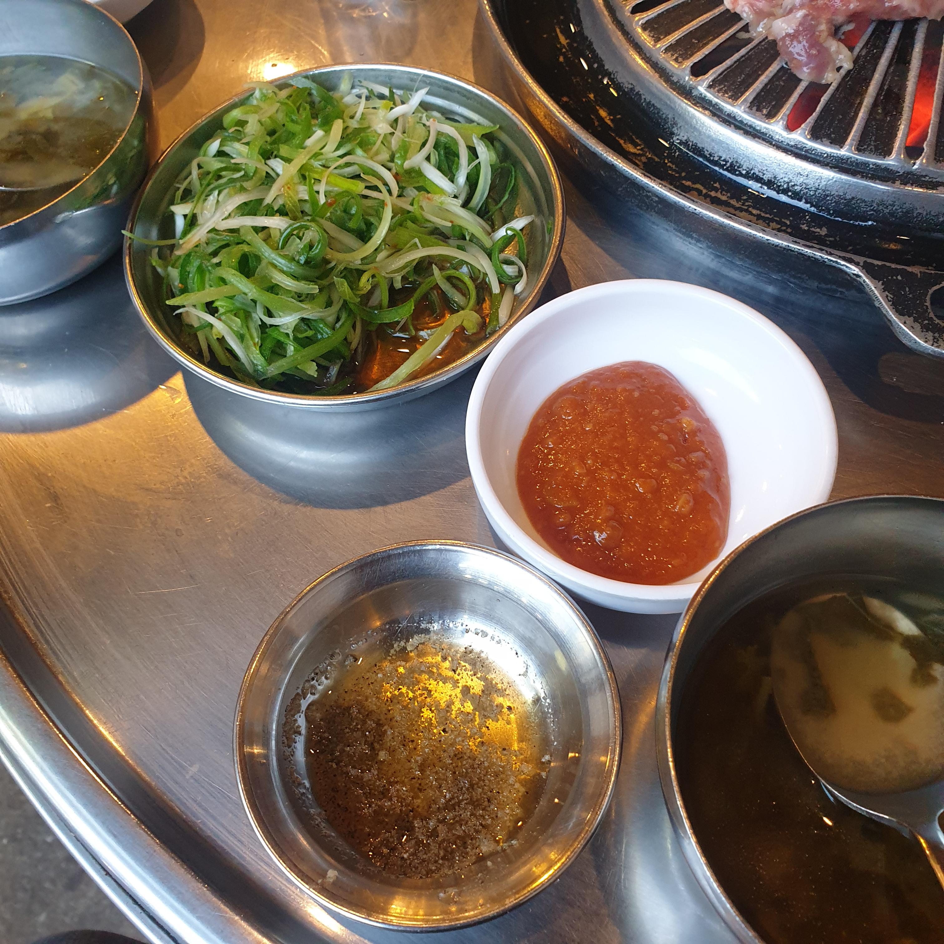 밑반찬으로 쌈장, 기름장, 파채, 된장국, 기본 쌈채소 마늘 그리고 김치가 나온다. 파채 같은 경우는 그냥 먹어도 고기랑 잘 어울렸으며 김치도 무난했다. 그런데.... 파채랑 김치는 그냥 먹어도 맛있지만???? 더 맛있게 먹을 수 있는 방법이 있다.