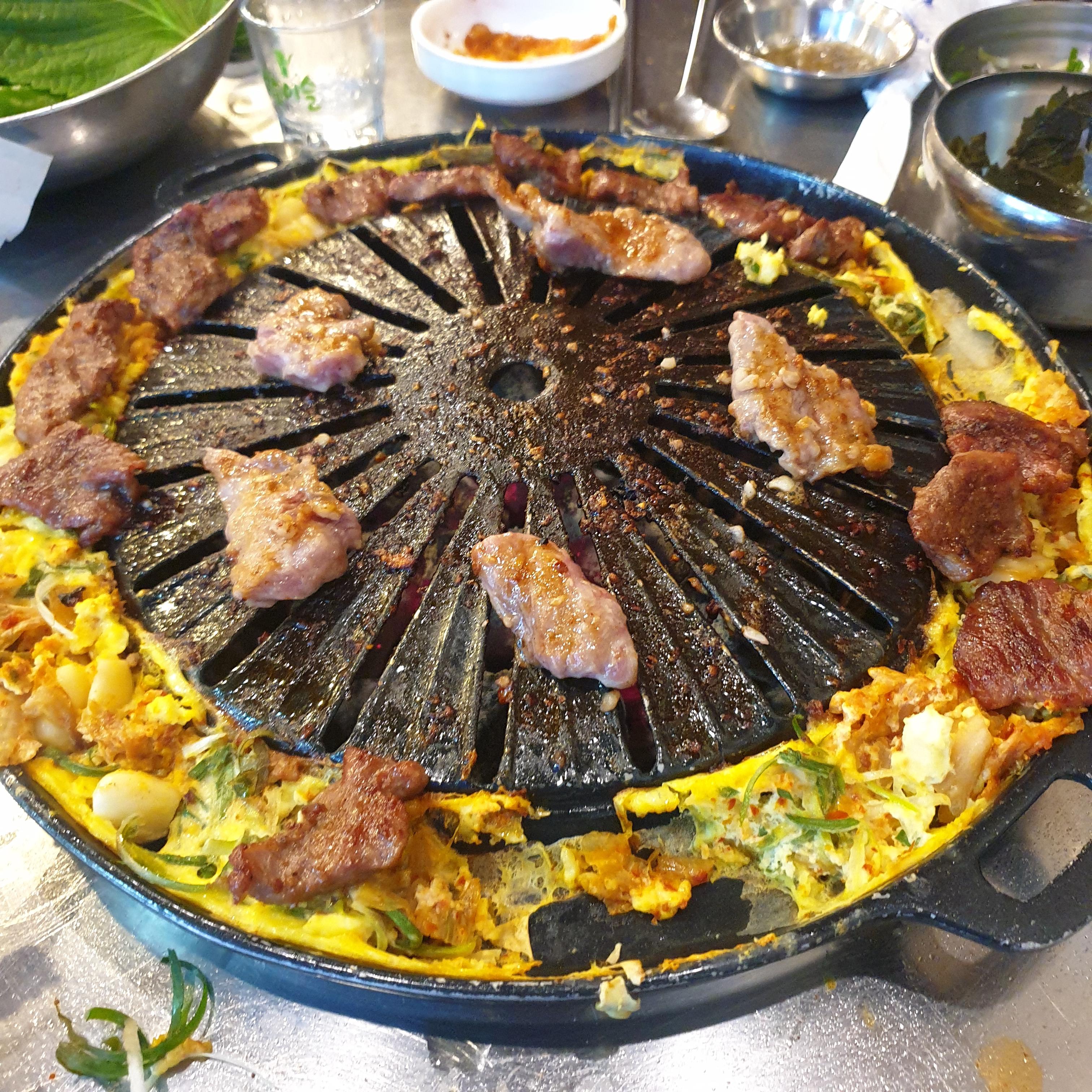 이렇게 가장자리에 파채와 김치를 넣고 계란물을 부어달라고 하면 부어주신다. 계란은 무한리필이니 더더욱 좋았다. 그냥 계란물만 부어서 먹는 사람도 있고 스타일 따라서 알아서 선택하면 됨. 근데 내 취향은 파채랑 김치 넣는 게 더 맛있었음.