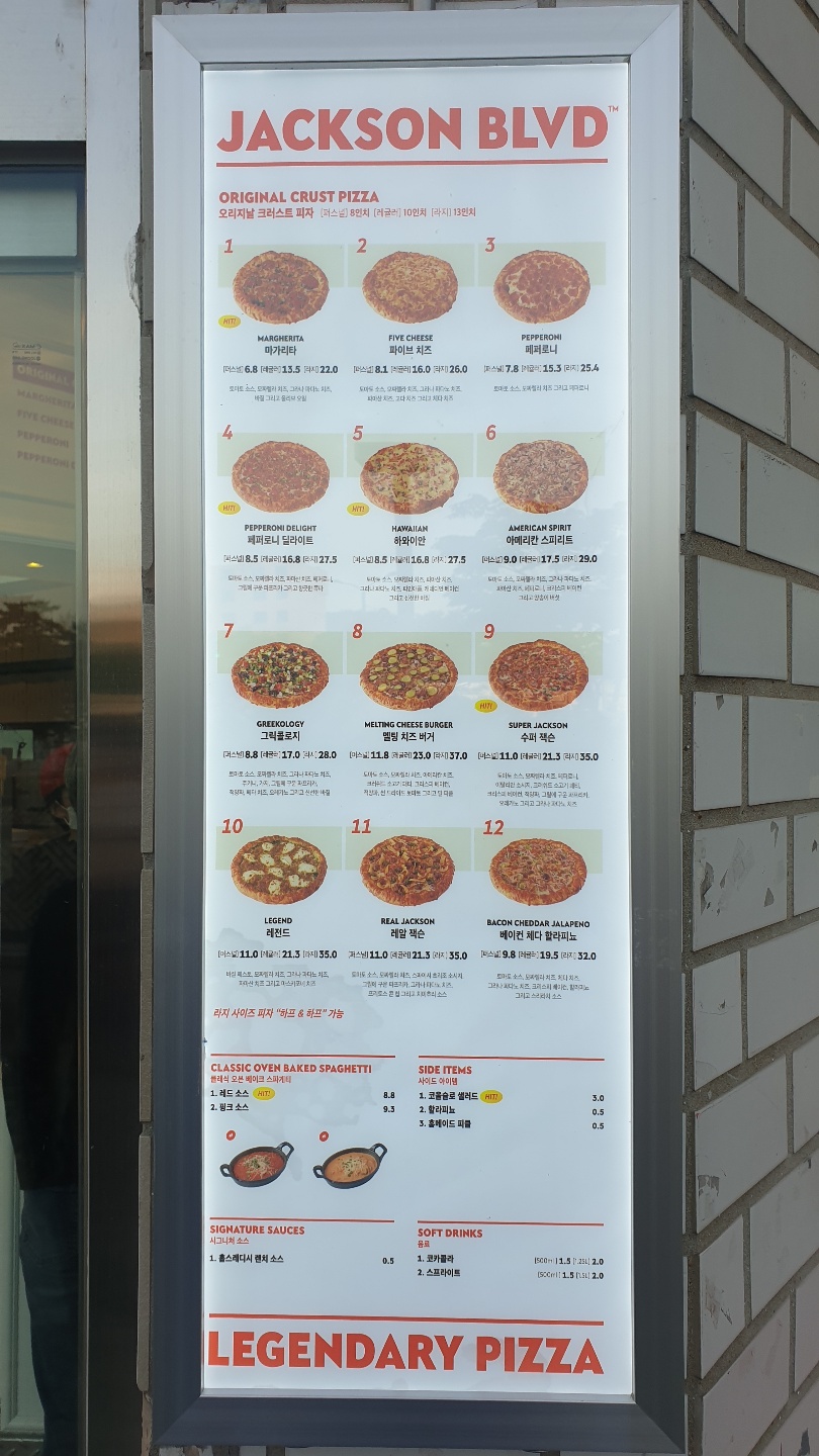 병원 치료를 정기적으로 받고 있어서 버스를 타고 왔다 갔다 하다 보니 삼각지역 고가도로 지나가다가 얼마 전부터 막 공사를 하는 모습을 봤다. 네온사인 간판이 새로 생긴 것으로 봐서 뭐 하는 곳인지 궁금했었는데 잭슨피자라는 것을 알았다. 그래서 '먹어봐야지.. 먹어봐야지..' 말만 하다가 이제서야 먹게되었다. 잭슨피자 삼각지점은 배달하고 포장만 가능하다고 한다. 가격이 싼 편은 아니지만 한번 쯤 먹을만하다. 베이컨 페퍼로니 등 짭짤한 토핑이 듬뿍 올라가있는 전형적인 미국식 피자다. 현재 서울에는 10여개의 지점이 있는 듯하다