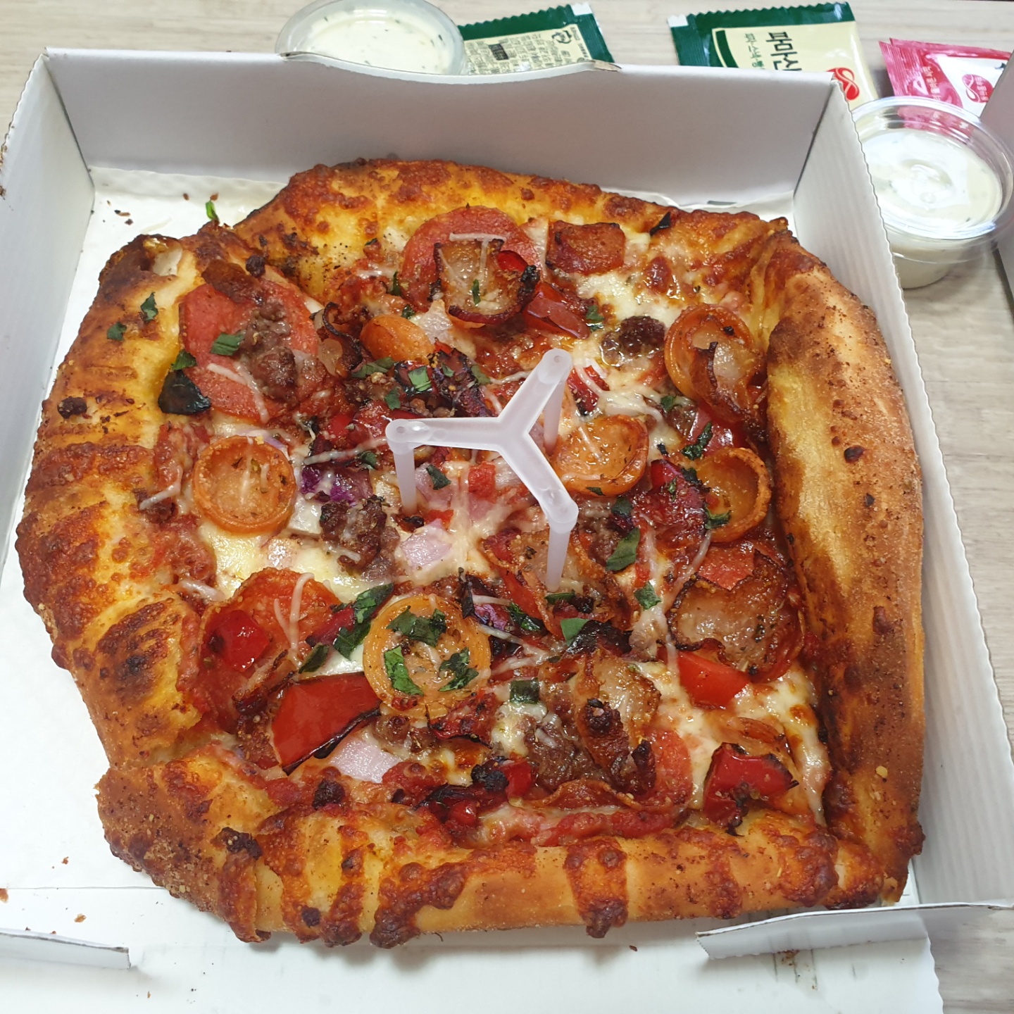 포장 후에 따끈한 상태로 먹으니 더 맛있었다. 짭조름한 페퍼로니와 베이컨 등이 잘 조화로운 피자였다. 도우는 쫀득쫀득하며 생각보다 두껍진 않았다. 또 피자에서 불맛이 났다. 맥주랑도 찰떡궁합일듯하다. 아쉬운점은 매장이 좁아서 포장만 된다는 사실이었다. 배달도 가능하다니 집밥말고 다른게 땡긴다면 잭슨피자 한번 먹어보는 것 어떨까?