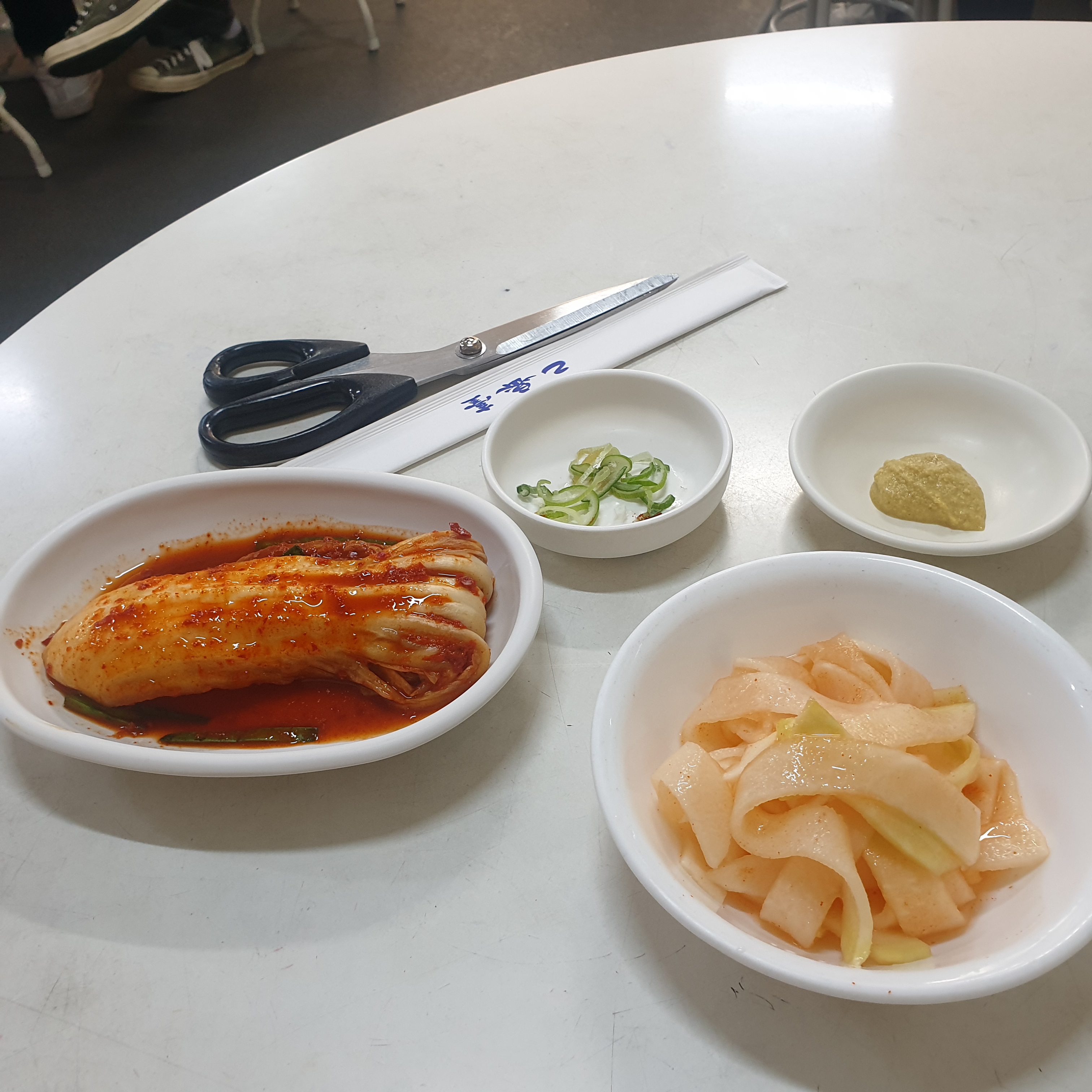 육수는 이렇게 주전자에 나온다. 컵은 뜨거운 육수를 부어도 손이 뜨겁지 않은 스텐잔과 함께 나온다. 기본 뜨끈한 육수는 곰탕같다. 아주 구수했다. 기본 밑반찬이 깔끔하다. 김치와 겨자 무말랭이가 나온다. 딱 김치가 저렇게 나오는게 반찬 재활용을 안하는 집이라는 것이 티가 난다. 저 김치를 냉면과 같이 먹을 것이고 분명히 저걸 잘라서 먹지 통째로 먹는 사람은 없을테니까. 파는 왜 나왔지? 생각했는데 간장을 부어서 녹두전과 찍어먹으라고 친절하게 안내해주시더라.