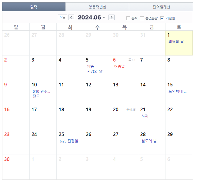 6월 6일은 현충일로 목요일이며, 7일에 휴가를 내면 4일간의 휴가를 즐길 수 있어요.